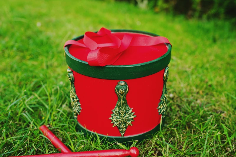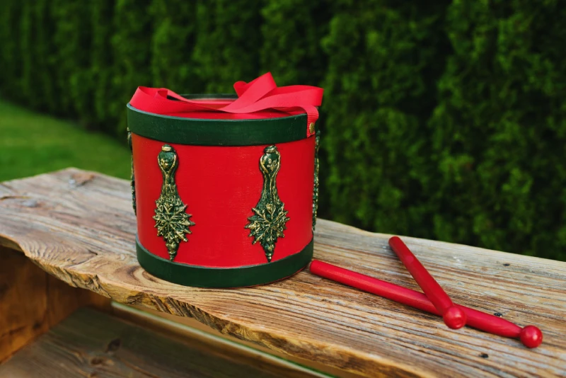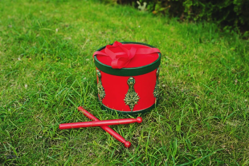 Bębenek - motyw czerwono-zielony. W zestawie pałeczki.