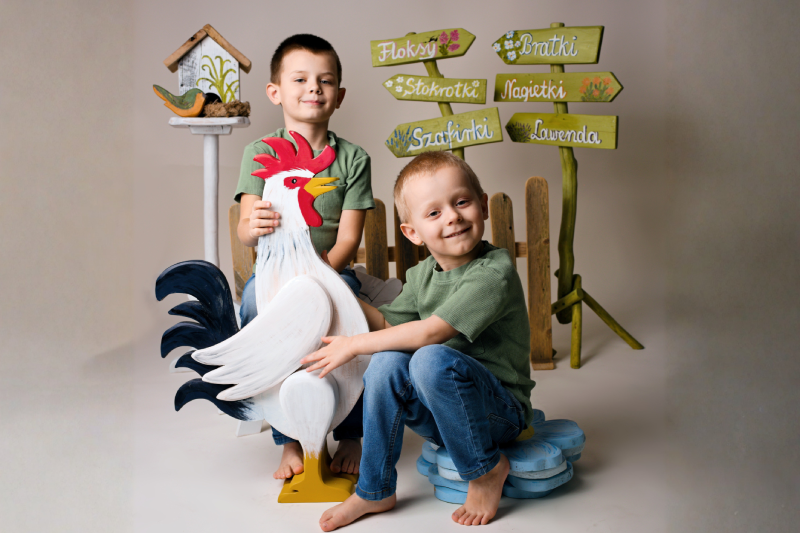 Dodaj sielskiego uroku swoim sesjom dzięki naszemu unikalnemu rekwizytowi w kształcie koguta. Ten ręcznie malowany, drewniany element dekoracyjny został zaprojektowany z myślą o sesjach dziecięcych, wielkanocnych oraz aranżacjach typu "village" lub "farm".