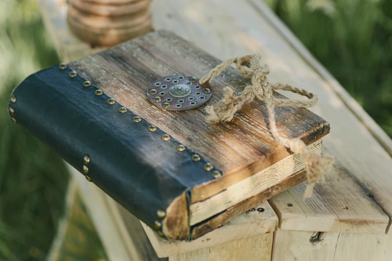 Solidna okładka wykonana z postarzanego, naturalnego drewna z wyraźnie widocznym usłojeniem. Każdy egzemplarz jest unikalny dzięki niepowtarzalnej fakturze i odcieniom drewna.