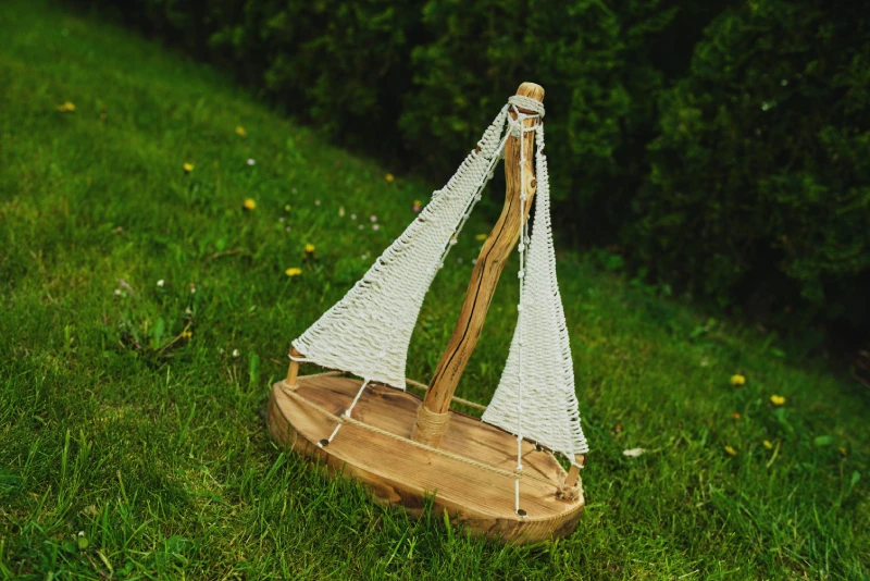 Podstawa została wykonana z litego drewna, maszt z naturalnej gałęzi i żagle z bawełnianego sznurka.