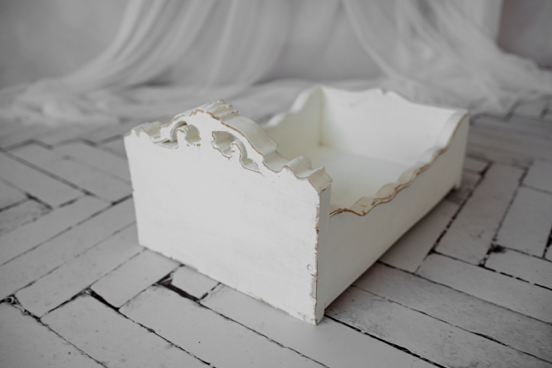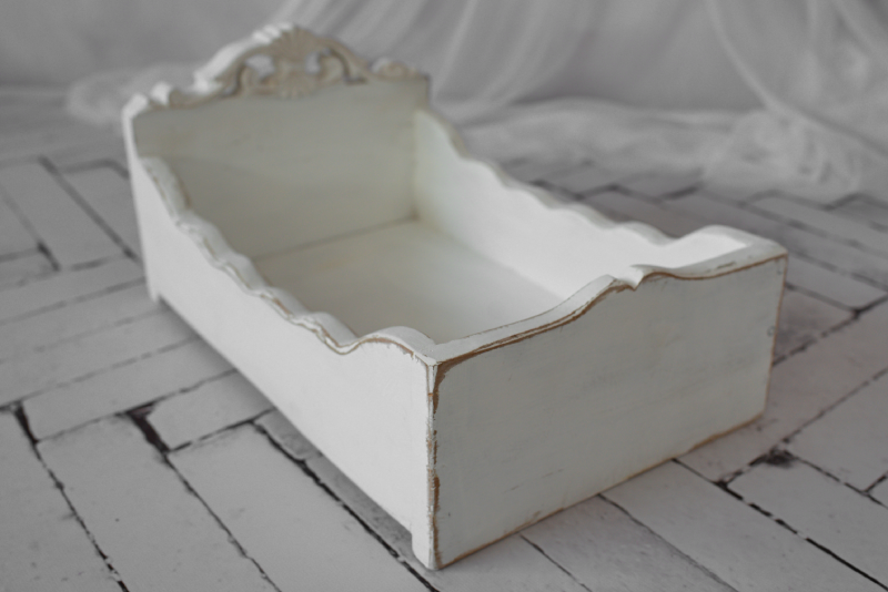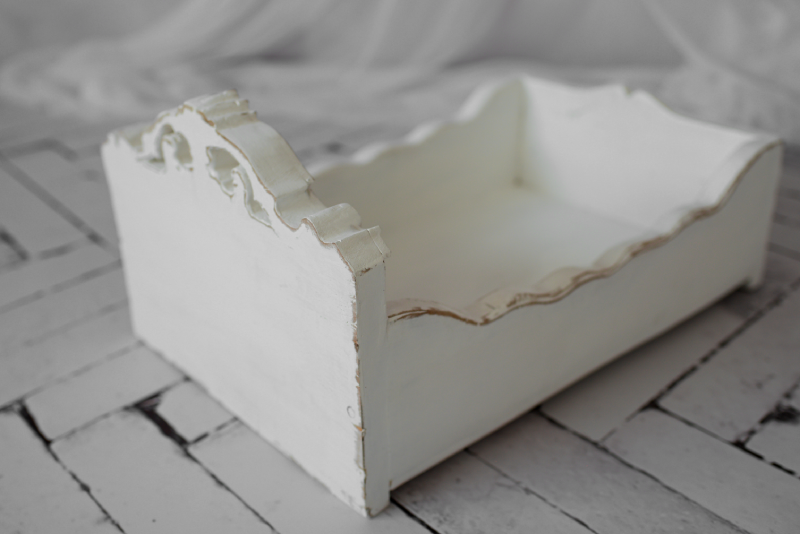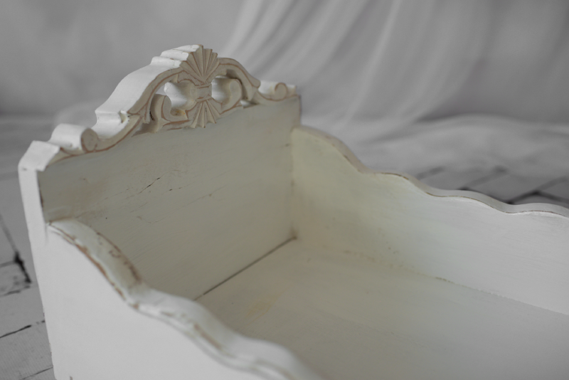 Przedstawiamy urocze, stylizowane łóżeczko w kolorze białym, idealne jako rekwizyt do sesji noworodkowych.