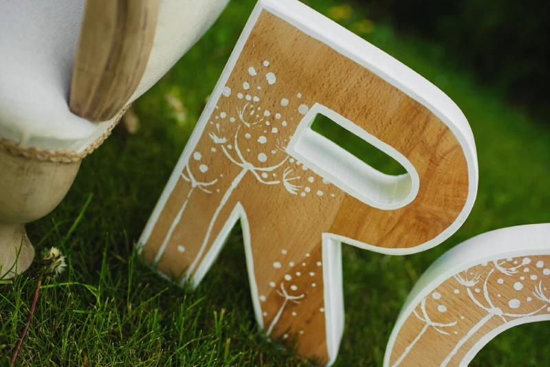 Każda litera została starannie wykonana z drewna, a jej boki pomalowano na biały kolor, co nadaje całości nowoczesnego, a zarazem klasycznego wyglądu. Front każdej litery pozostawiono w naturalnym odcieniu drewna, co podkreśla jego ciepło i organiczną fakturę.