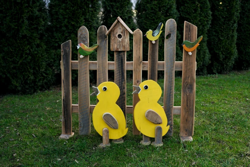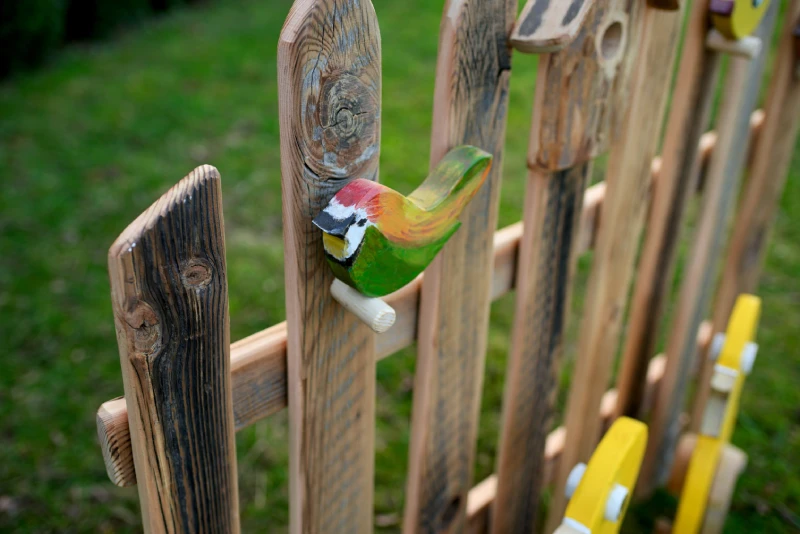 Konstrukcję zdobią ręcznie malowane, kolorowe ptaszki oraz budka lęgowa.