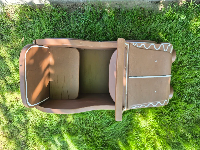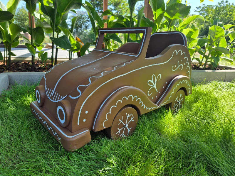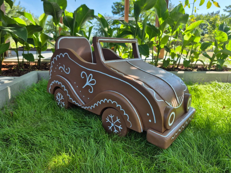 Samochód w brązowym kolorze imitującym piernik, ozdobiony precyzyjnymi, białymi wzorami przypominającymi lukier.